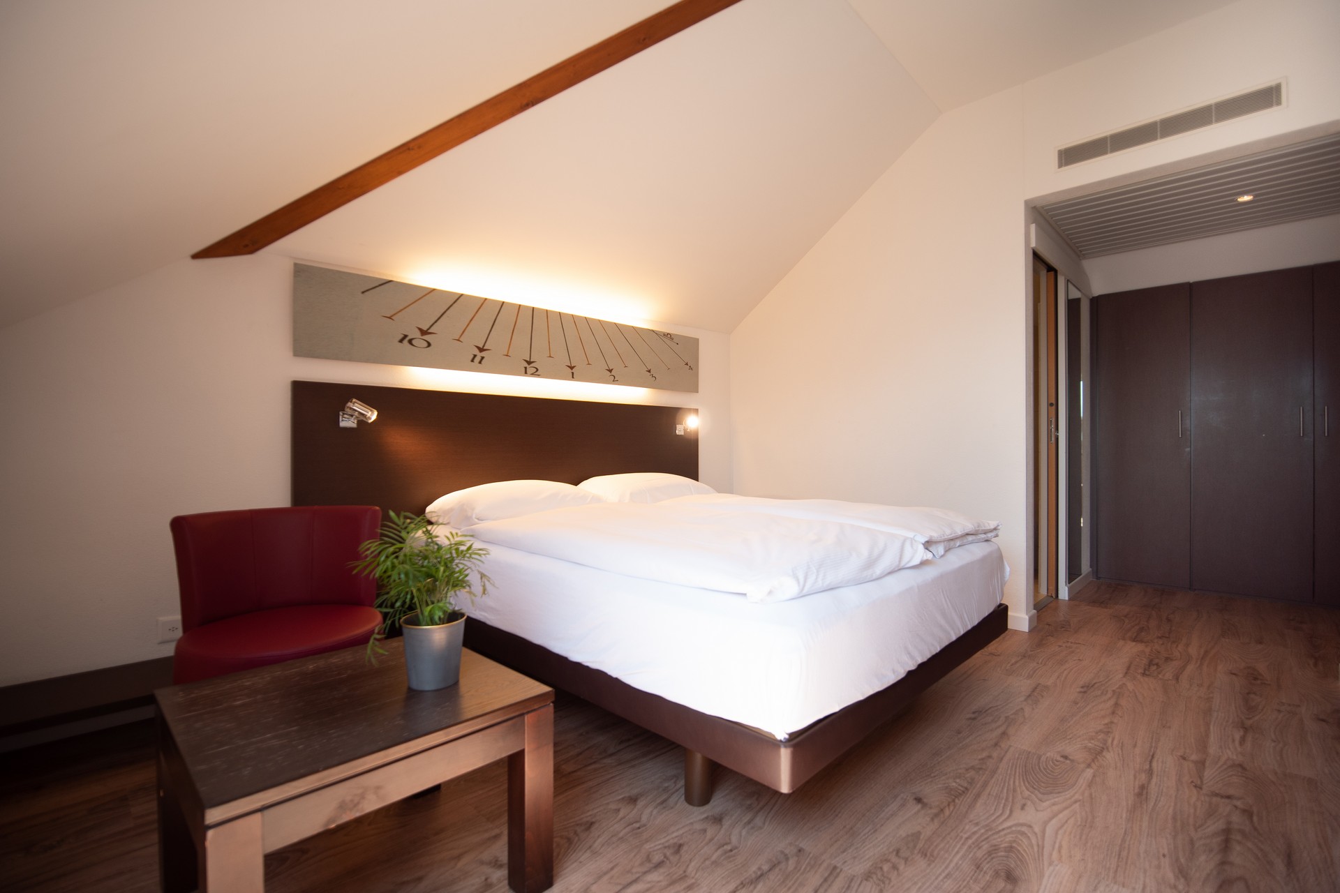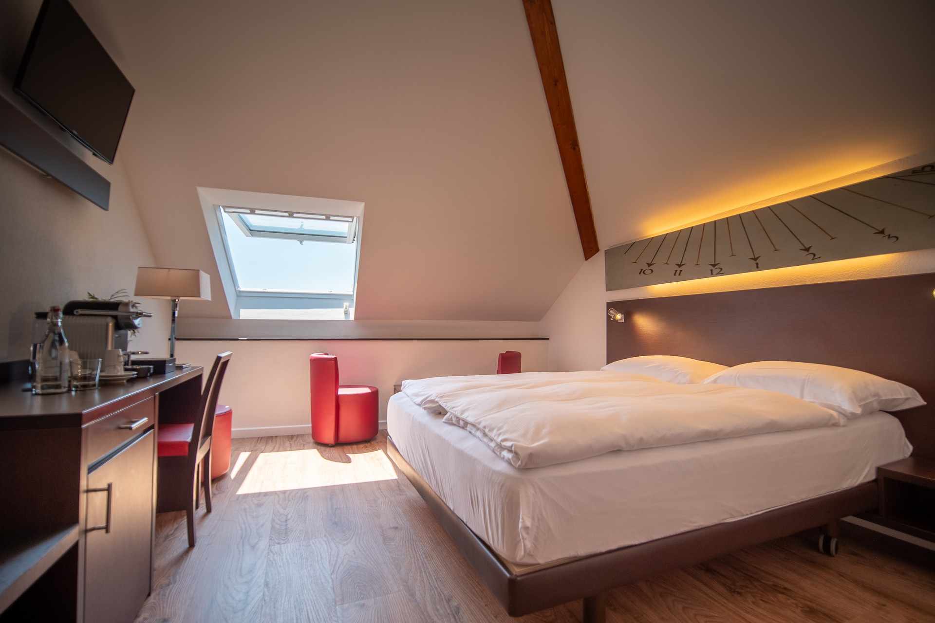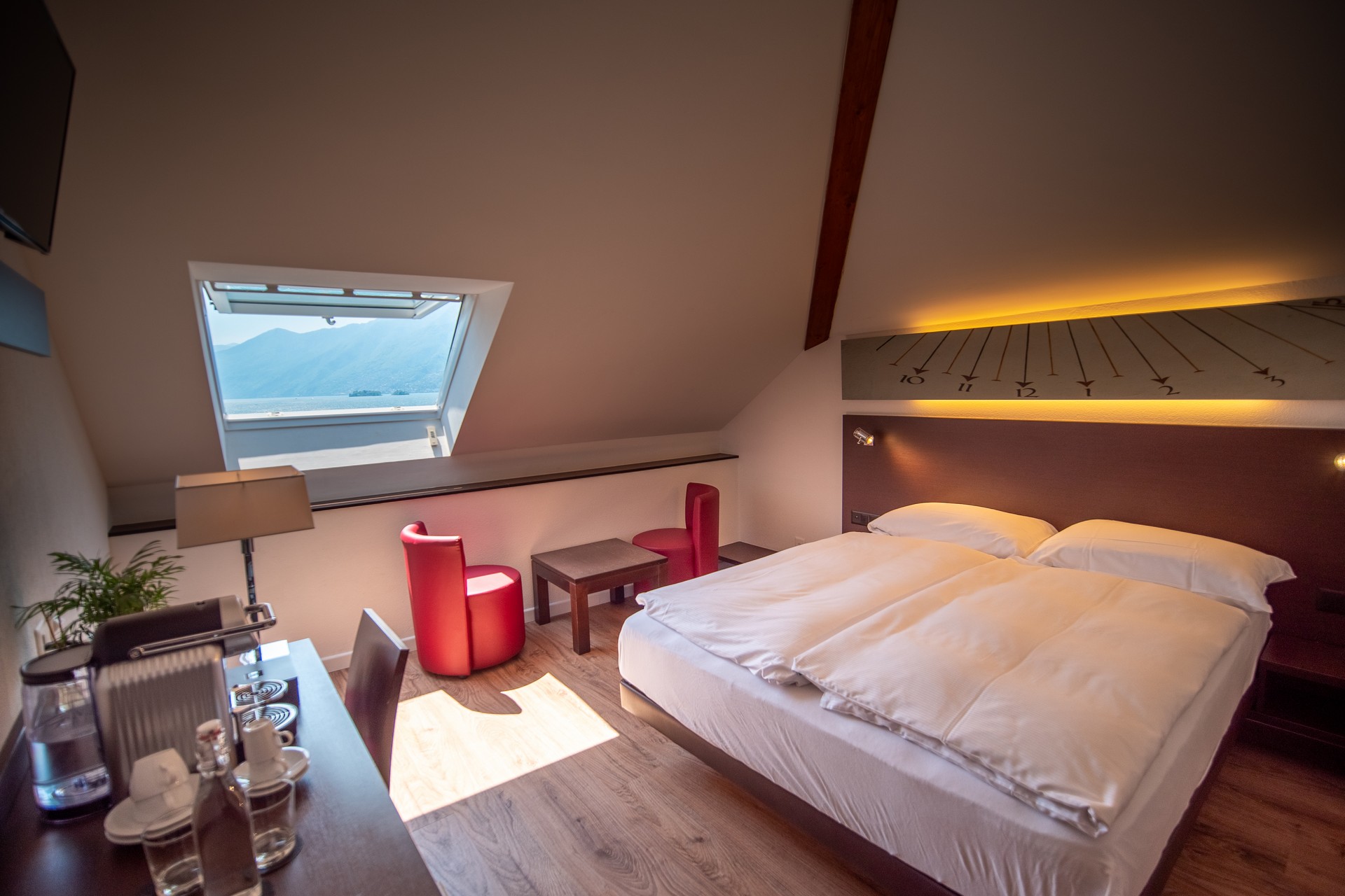 Un’elegante camera doppia con letto Queen Size e una suggestiva vista parziale sul Lago Maggiore, perfetta per una fuga romantica.